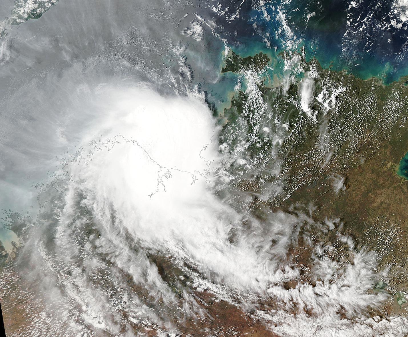 The Moderate Resolution Imaging Spectroradiometer (MODIS) on NASA’s Aqua satellite acquired this true-color image of compact Tropical Storm Fina crossing the Kimberly coast on November 24.